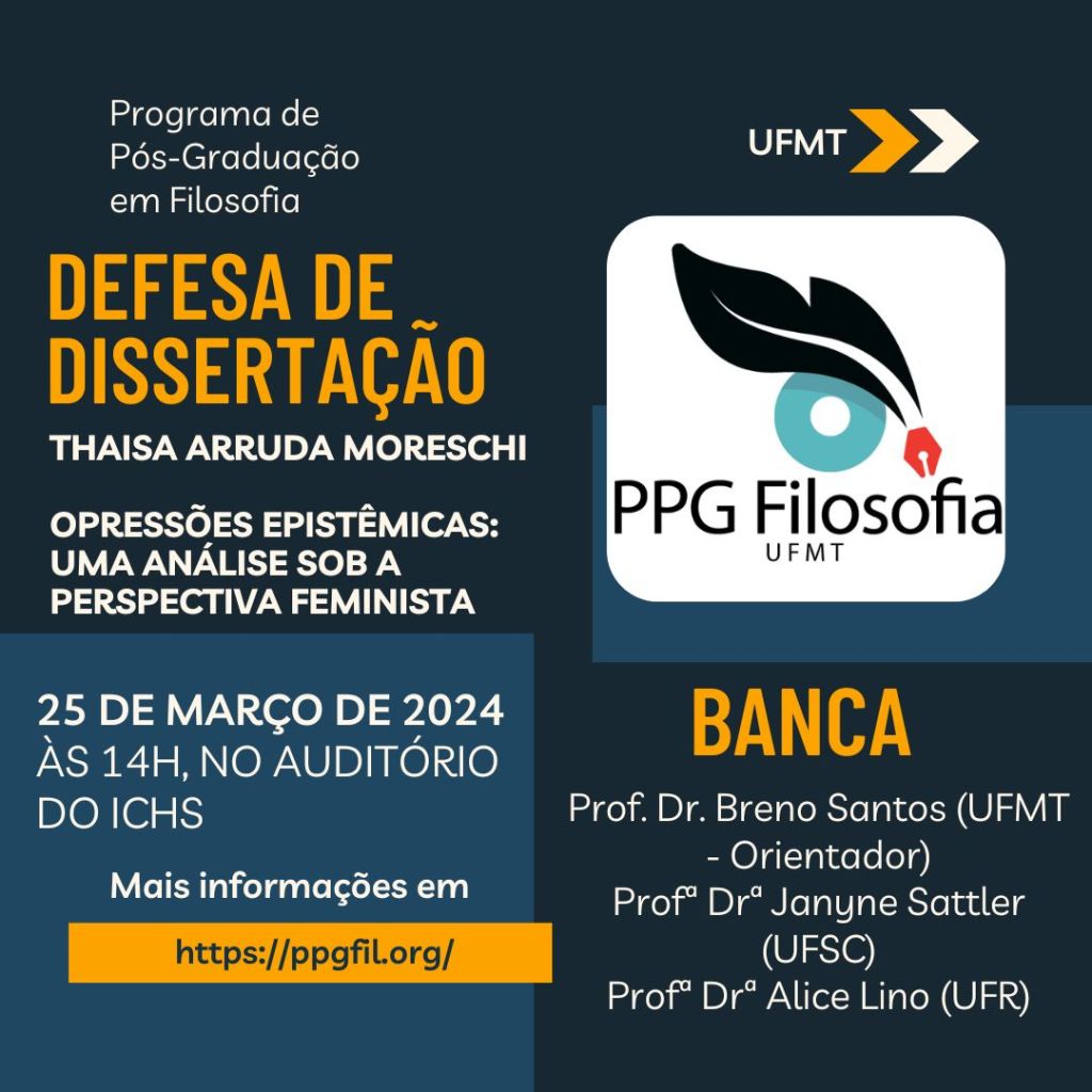 O Programa de Pós Graduação em Filosofia da UFMT convida o público para a banca de defesa de Thaisa Arruda Moreschi, com o título “Opressões Epistêmicas: Uma análise sob a perspectiva feminista”, a ocorrer no auditório do ICHS, campus Cuiabá, às 14 horas. A banca será formada pelo Prof. Dr. Breno Santos (UFMT, orientador e presidente da banca), Profa. Dra. Janyne Sattler (UFSC, examinadora externa) e pela Profa. Dra. Alice Lino Lecci (UFR e PPGFil UFMT, examinadora interna).