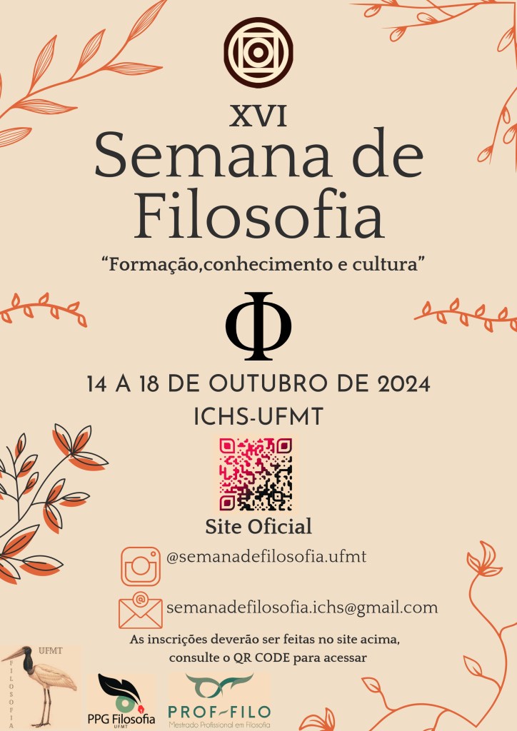 A XVI Semana de Filosofia da UFMT “Formação, Conhecimento e Cultura” é uma atividade de extensão, gratuita, realizada pelo Departamento de Filosofia, os cursos de Graduação em Filosofia (Bacharelado e Licenciatura) e de pós-graduação em Filosofia (Mestrado Acadêmico e Mestrado Profissional). A Semana de Filosofia expõe e discute as pesquisas do corpo docente e discente da universidade, aliando nesta iniciativa um registro variado de experiências e atividades acadêmicas, e promove o diálogo com pesquisadoras e pesquisadores de outras universidades brasileiras. Propicia aos/às estudantes e outros/as participantes uma relação direta com os fazeres típicos da academia – pesquisa, ensino e extensão – num espírito de trabalho e investigação conjuntos.