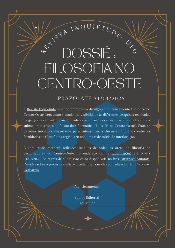 A Revista Inquietude, visando promover a divulgação do pensamento filosófico no Centro-Oeste, bem como visando dar visibilidade às diferentes pesquisas realizadas na geografia central do país, convida as pesquisadoras e pesquisadores de filosofia a submeterem artigos ao futuro dossiê temático “Filosofia no Centro-Oeste”. Trata-se de uma iniciativa importante para intensificar a discussão filosófica entre as faculdades de filosofia na região, criando uma rede sólida de interlocução.