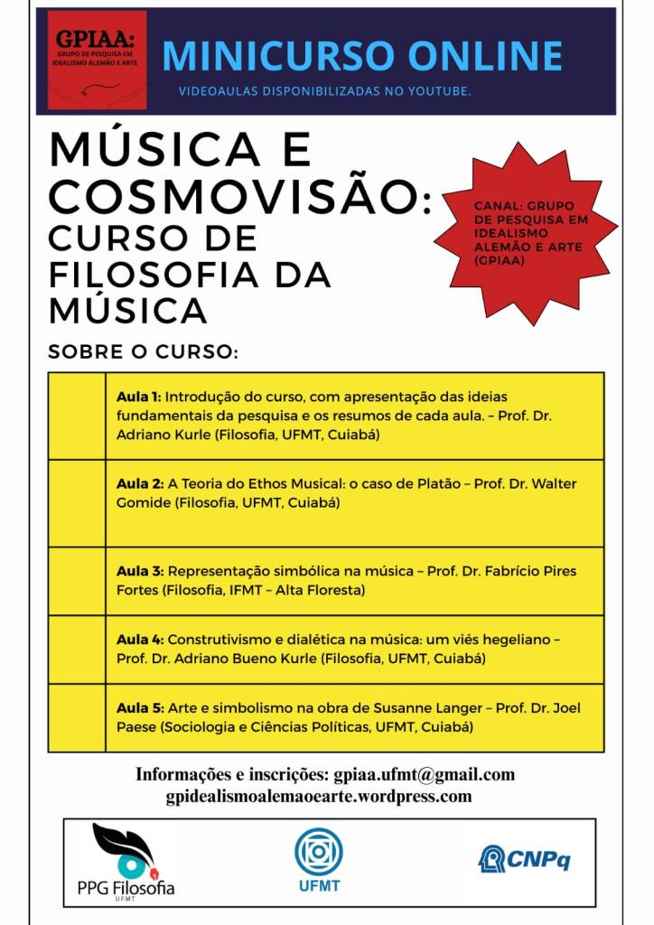 O curso “Música e Cosmovisão: curso de filosofia da música” consiste em cinco videoaulas que serão disponibilizadas online, de modo aberto, no canal do Grupo de Pesquisa em Idealismo Alemão e Arte (GPIAA) no Youtube. O curso cumpre simultaneamente as funções de ensino e propagação da filosofia da música e de divulgação dos resultados da pesquisa. Trata da relação entre cosmovisão e música a partir da perspectiva desta pesquisa, somando aulas sobre música na Antiguidade Grega e em Platão e na filosofia de Susanne Langer. Além dos membros do projeto, Prof. Adriano Kurle e Prof. Fabrício Fortes, o curso também traz a cooperação do Prof. Walter Gomide (Filosofia, UFMT) e do Prof. Joel Paese (Sociologia e Ciências Políticas, UFMT).